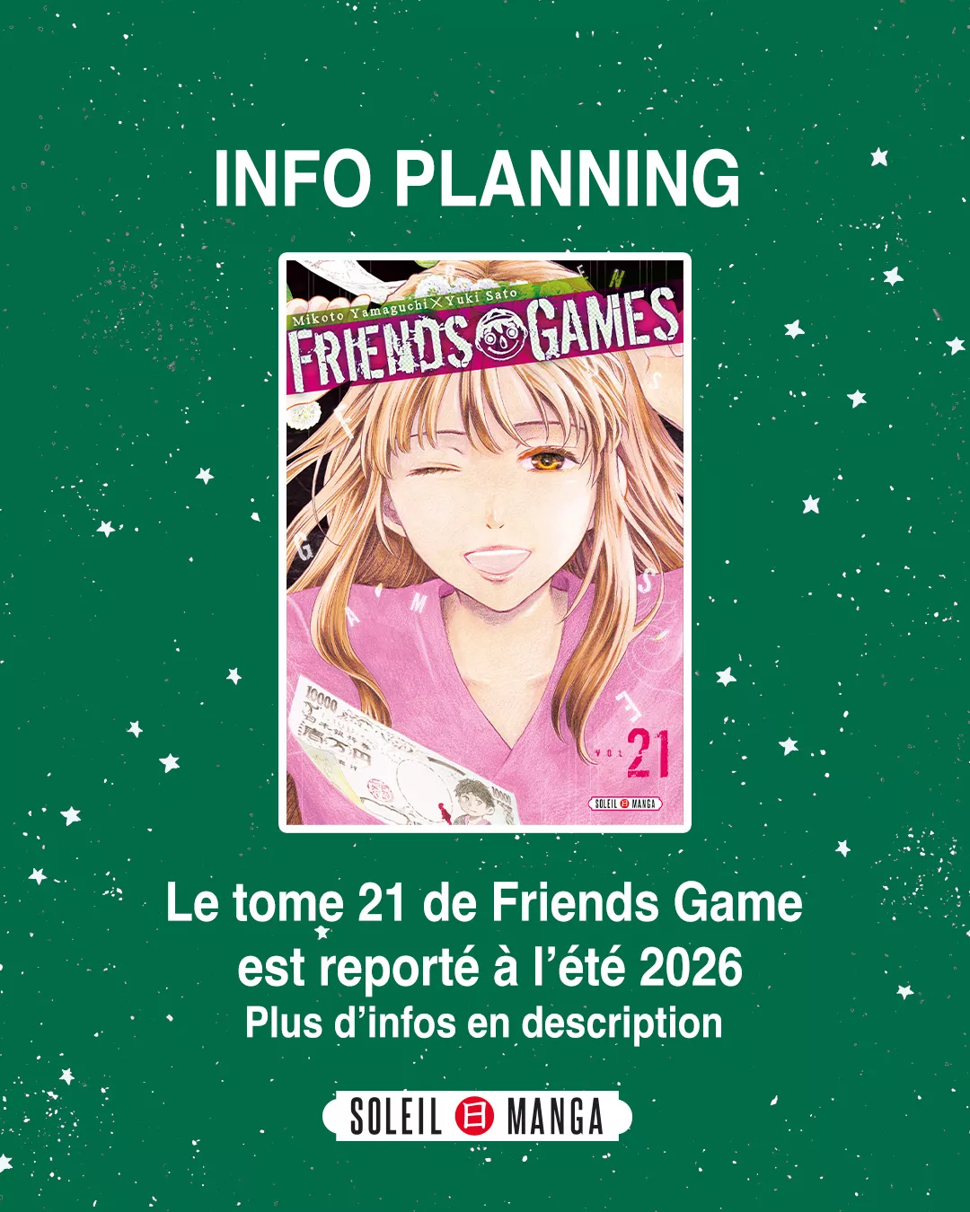 Ainsi, le tome 3 d'Aza-Koi se voit repoussé au printemps 2026, tandis que le volume 21 de Friends Games est quant à lui reporté à l'été 2026.