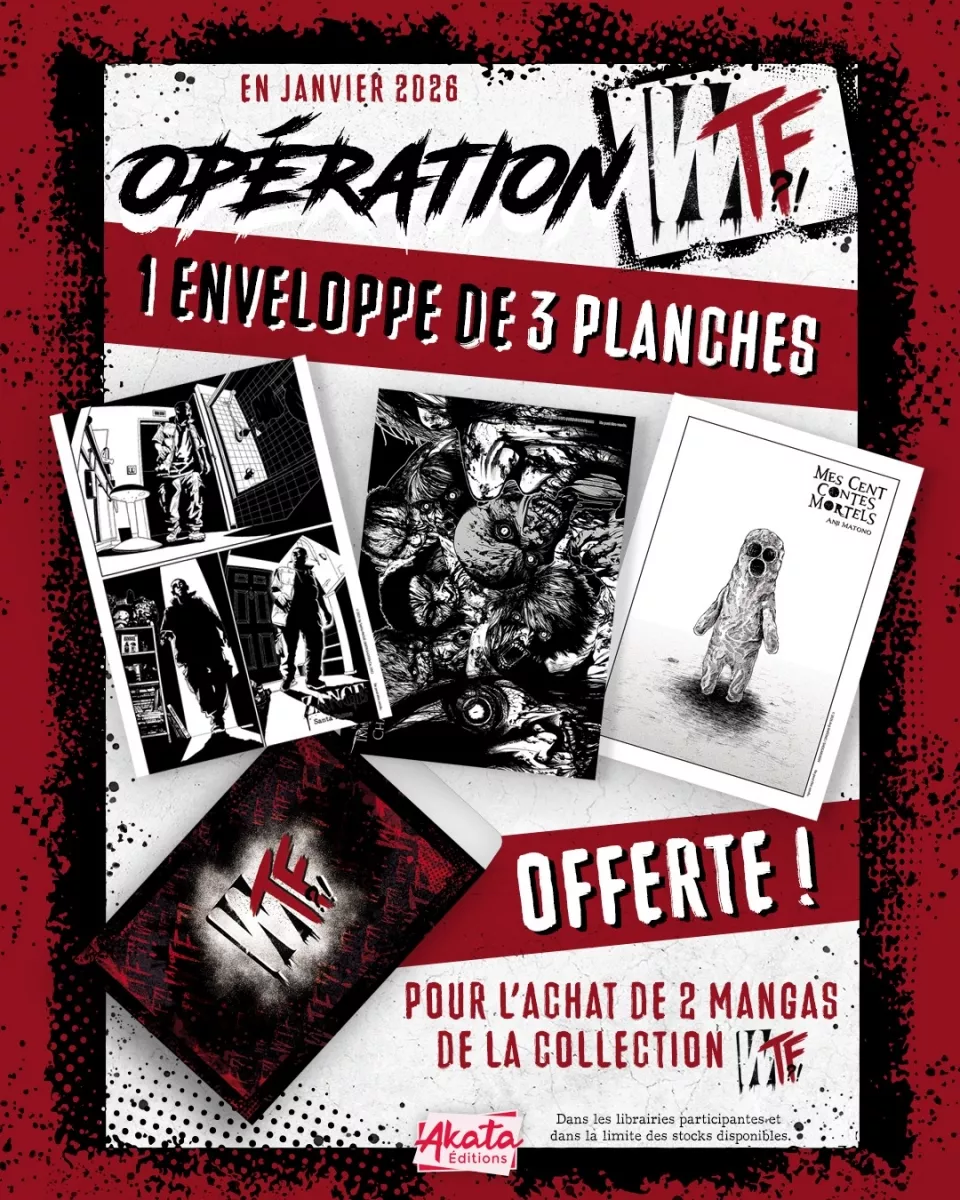 Notons enfin que, pour ce lancement, l'éditeur proposera une opération sur son label WTF ?! : pour l’achat de deux mangas de la collection, vous pourrez repartir avec une enveloppe contenant trois reproductions de planches des séries Zange, Mes cent contes mortels et Immortalité et châtiment, ces deux dernières séries ayant elles aussi un nouveau tome prévu le 28 janvier.