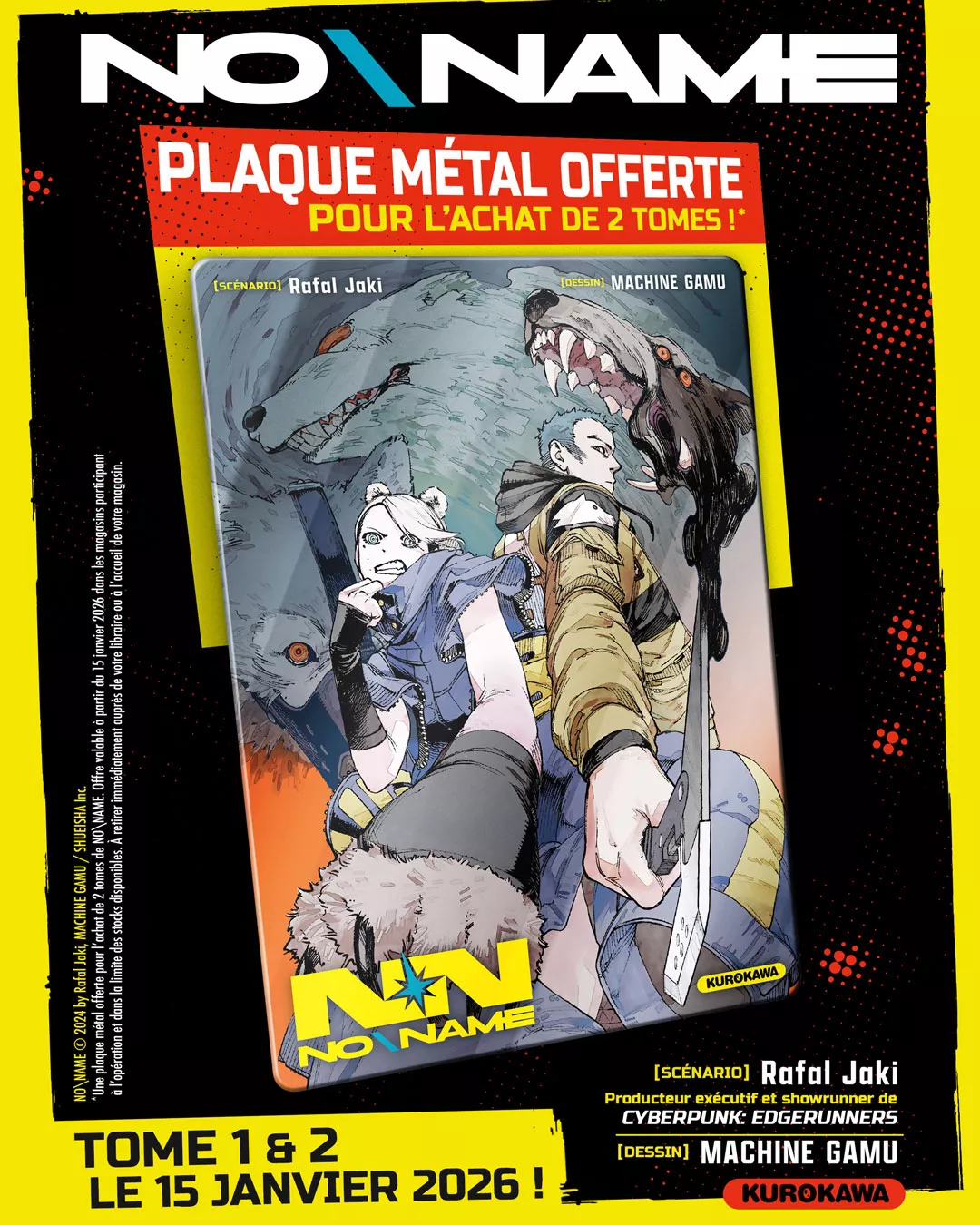 A l'occasion de la sortie simultanée chez elles des deux tomes de No\Name le 15 janvier 2026, les éditions Kurokawa proposeront un petit cadeau aux fans: une plaque en métal, qui sera offerte pour l'achat des deux volumes.
