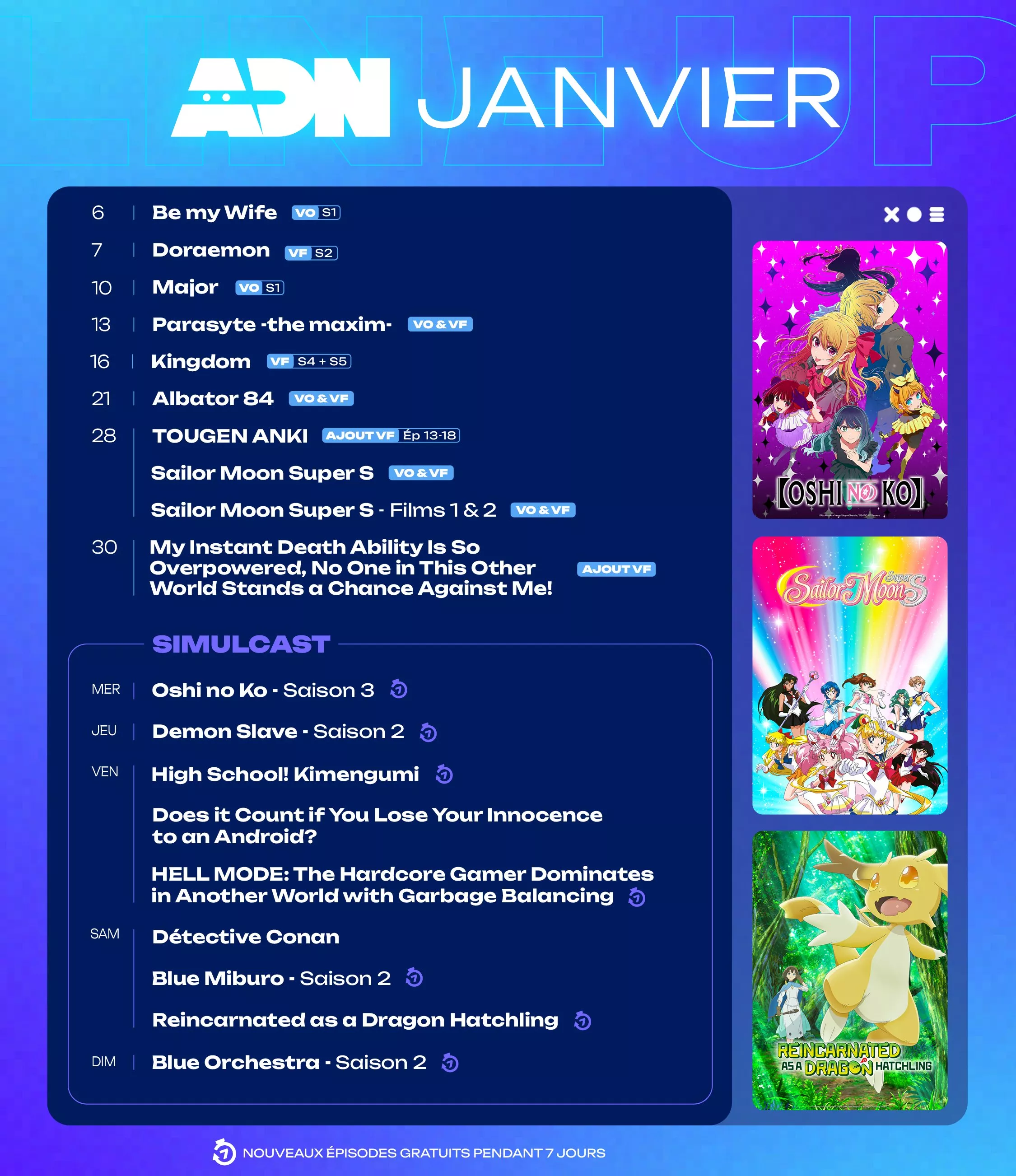 Après vous avoir présenté, vendredi dernier, les nouveaux simulcasts prévus sur ADN cet hiver (lire la news), revenons sur les animes qui enrichiront le fond de catalogue de la plateforme en ce mois de janvier.