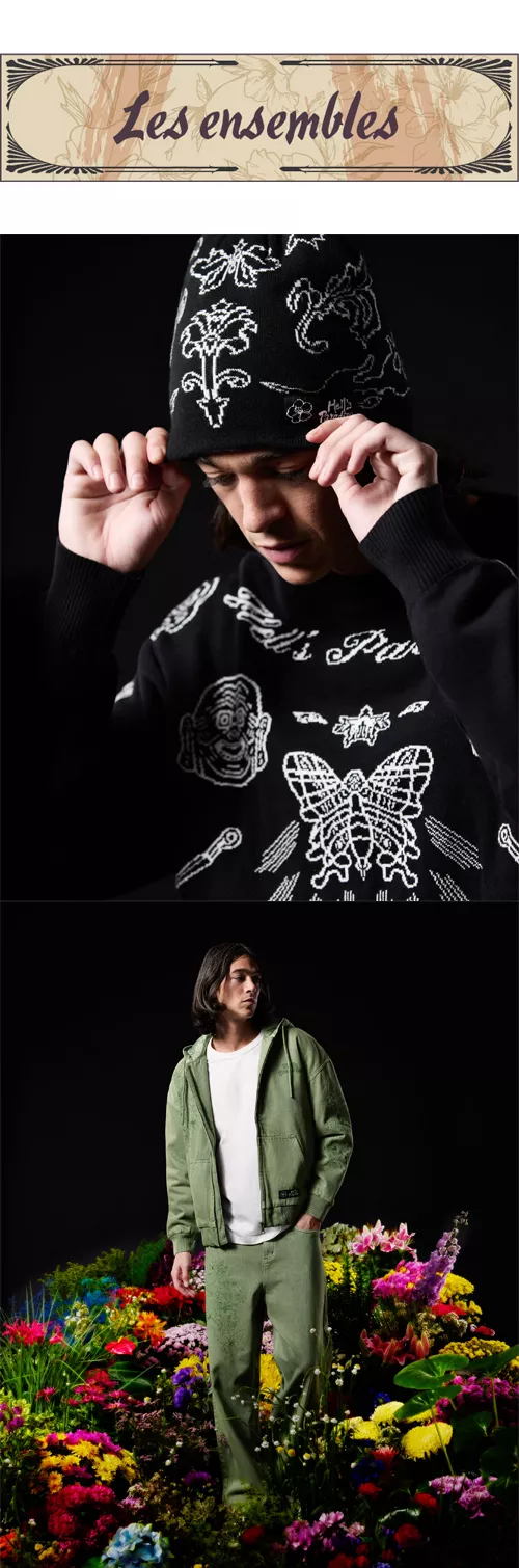 - 2 ensembles : 1 pull en maille noir et blanc, accompagné d’un bonnet assorti, reprenant fleurs, monstres et symboles de l’anime et 1 ensemble veste et pantalon décoré de fleurs brodées, avec un patch Hell’s Paradise et des visuels de Gabimaru et Sagiri.