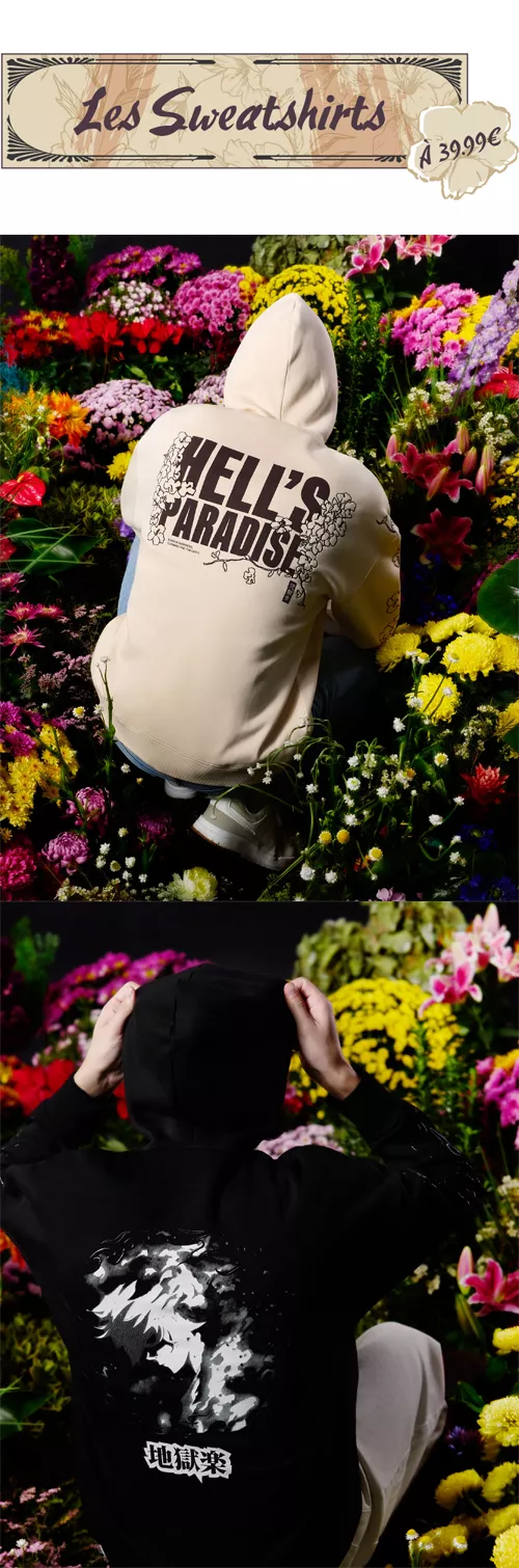 - 2 sweatshirts, dont un modèle brodé de fleurs symbolisant Shinsenkyo et un autre dédié à Gabimaru, avec motifs de flammes et illustration au dos.