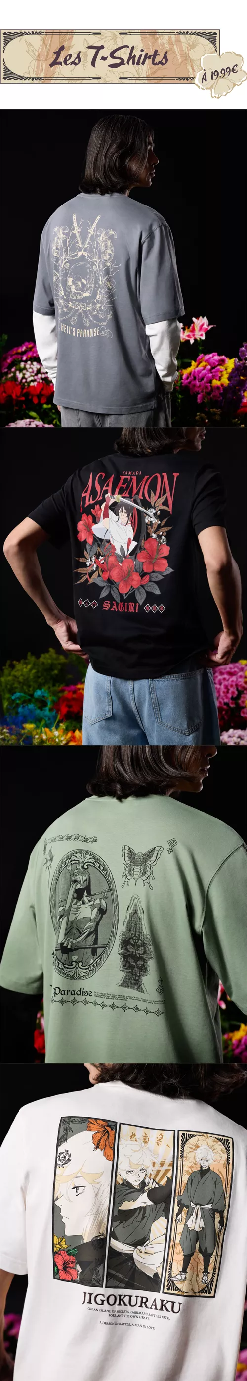 - Plusieurs T-shirts à l’effigie de Hell’s Paradise, mettant en avant Gabimaru, Sagiri, la famille Yamada Asaemon, ainsi que les dangers de l’île de Shinsenkyo, avec illustrations, citations et références au Tao.