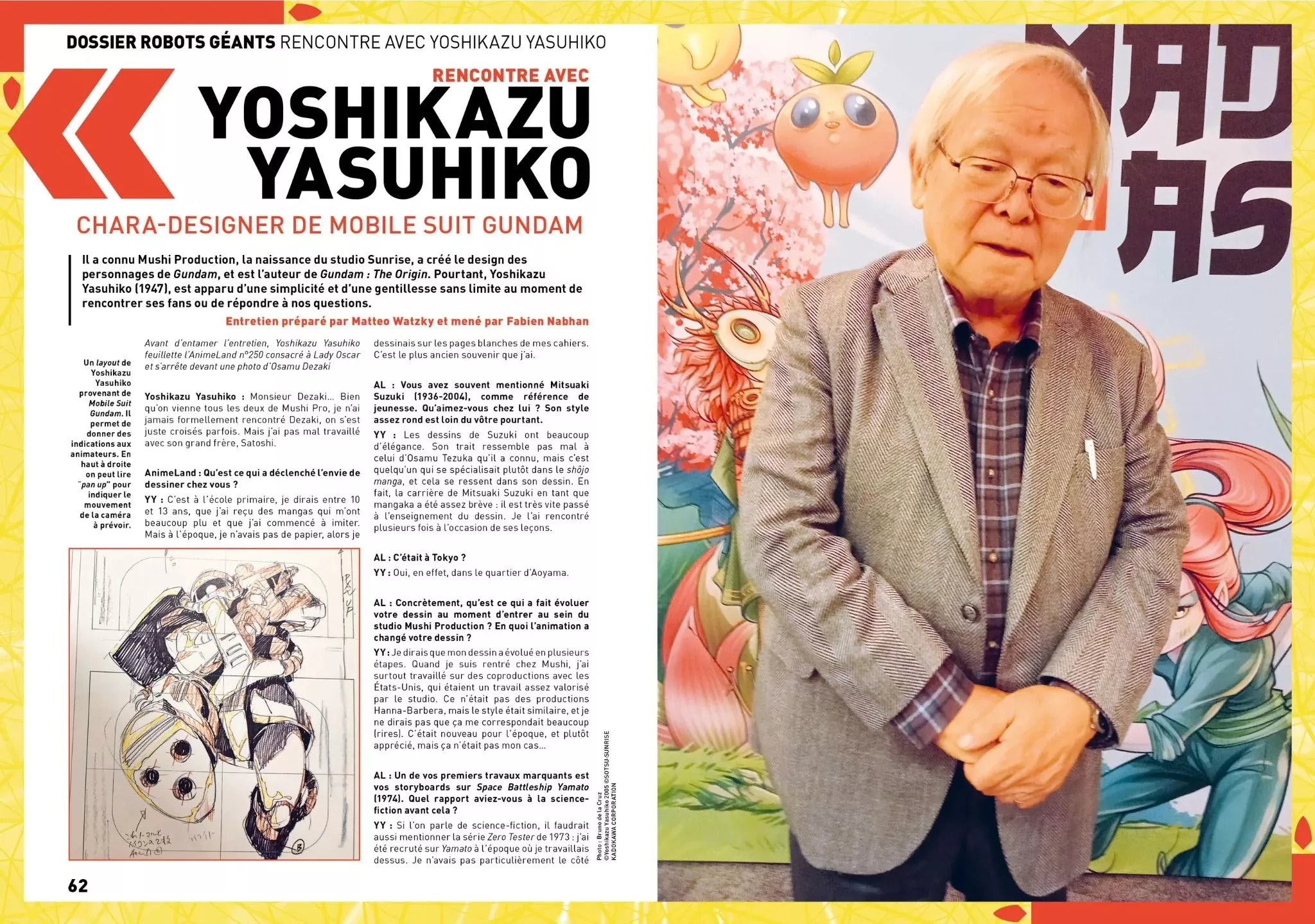 Un genre aussi développé via différents entretiens avec des figures majeures. Aussi, vous pouvez y trouver des interviews de Yoshikazu Yasuhiko (character-designer de Mobile Suit Gundam et mangaka de Mobile Suit Gundam - The Origin), Gorô Taniguchi (réalisateur de Code Geass et de One Piece Red), Toshihiro Kawamoto (character-designer de Mobile Suit Gundam 0080 : War in the Pocket et Mobile Suit Gundam 0083 : Stardust Memory), Shinji Aramaki (réalisateur, entre autre, d'AppleSeed) et Yoshitomo Yonetani (réalisateur de GaoGaigar). Des retours sur les conférences publiques de Yoshikazu Yasuhiko à Made in Asia et du staff de Gundam GQuuuuuuX à Japan Expo viennent compléter ce panel d'auteurs. Enfin, vous serez immergés en direct du Japon au coeur des expositions dédiées à Yoshikazu Yasuhiko et Mamoru Nagano, l'auteur de Five Star Stories.