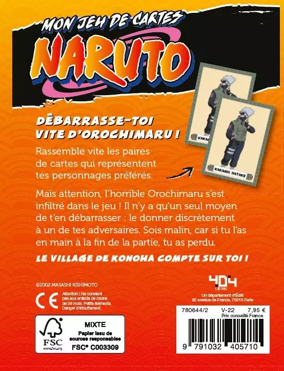 Rassemble vite les paires de cartes qui représentent tes personnages préférés. Mais attention, l'horrible Orochimaru s'est infiltré dans le jeu ! Il n'y a qu'un seul moyen de t'en débarrasser : le donner discrètement à un de tes adversaires.