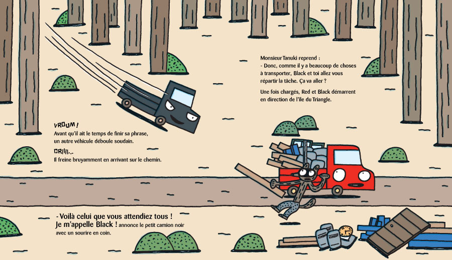 Pour sa nouvelle livraison, Red doit faire équipe avec un autre petit camion : Black, un véhicule tout noir au caractère bien trempé, qui ne jure que par la vitesse ! Au début, Red est un peu décontenancé par l’attitude de son coéquipier et s’inquiète beaucoup de le voir provoquer un accident... Mais après un rappel à l’ordre de la part d’une voiture de police, Black devient enfin raisonnable. Ainsi, Red va vite découvrir que derrière ses airs de fanfaron, Black est un petit camion toujours prêt à aider les autres.