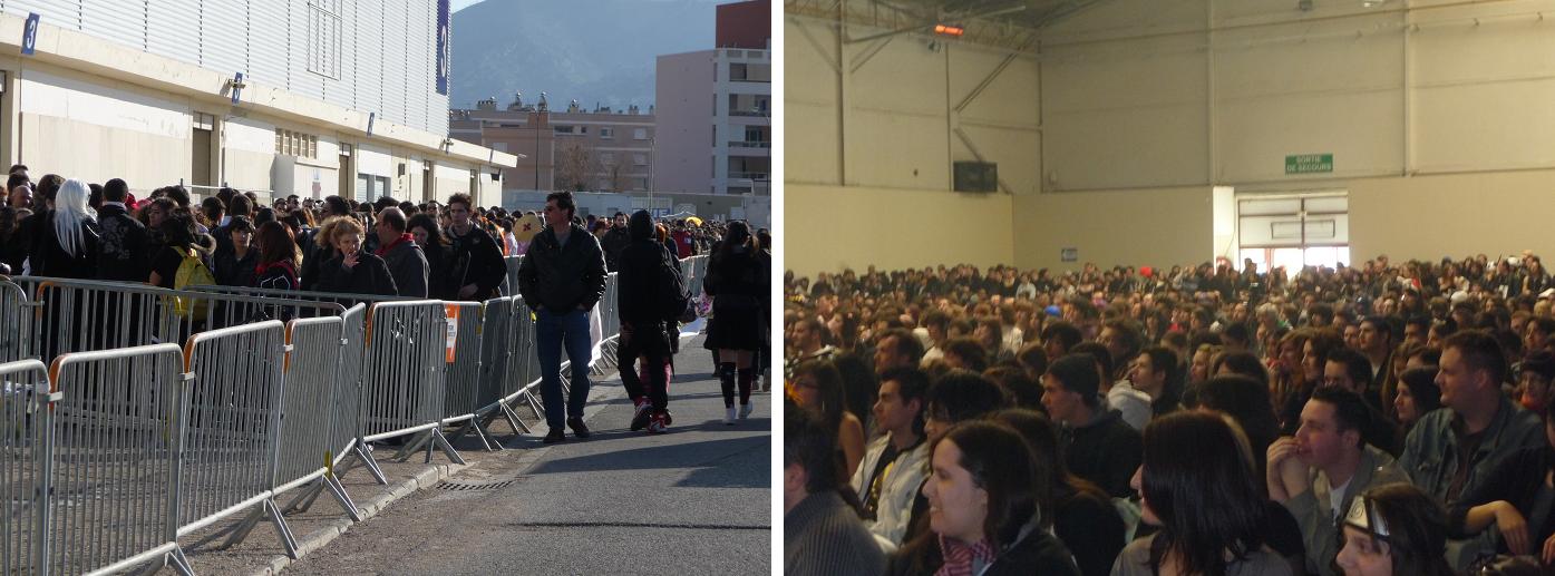 Après le frimas qui a transi la France ces dernières semaines, on pouvait espérer des jours meilleurs pour cette convention. Cependant, il aura fallu attendre le samedi pour obtenir quelques faibles rayons de soleil, bien loin de la canicule juilletiste. En effet, en guise d'accueil en ce vendredi 19 février 2010, temps maussade et pluies fréquentes étaient au programme. Cependant, à ma grande surprise, cela n'a pas découragé les visiteurs les plus acharnés de répondre présent au rendez-vous ! Voici en effet l'affluence à 11h, soit une heure avant l'ouverture de la file des préventes, deux heures avant celle de la billetterie.Une affluence assez inattendue au vu du démarrage timide de l'an dernier. Voilà donc une première impression plutôt encourageante, même si cela n'était évidemment rien face au raz-de-marée du samedi!
