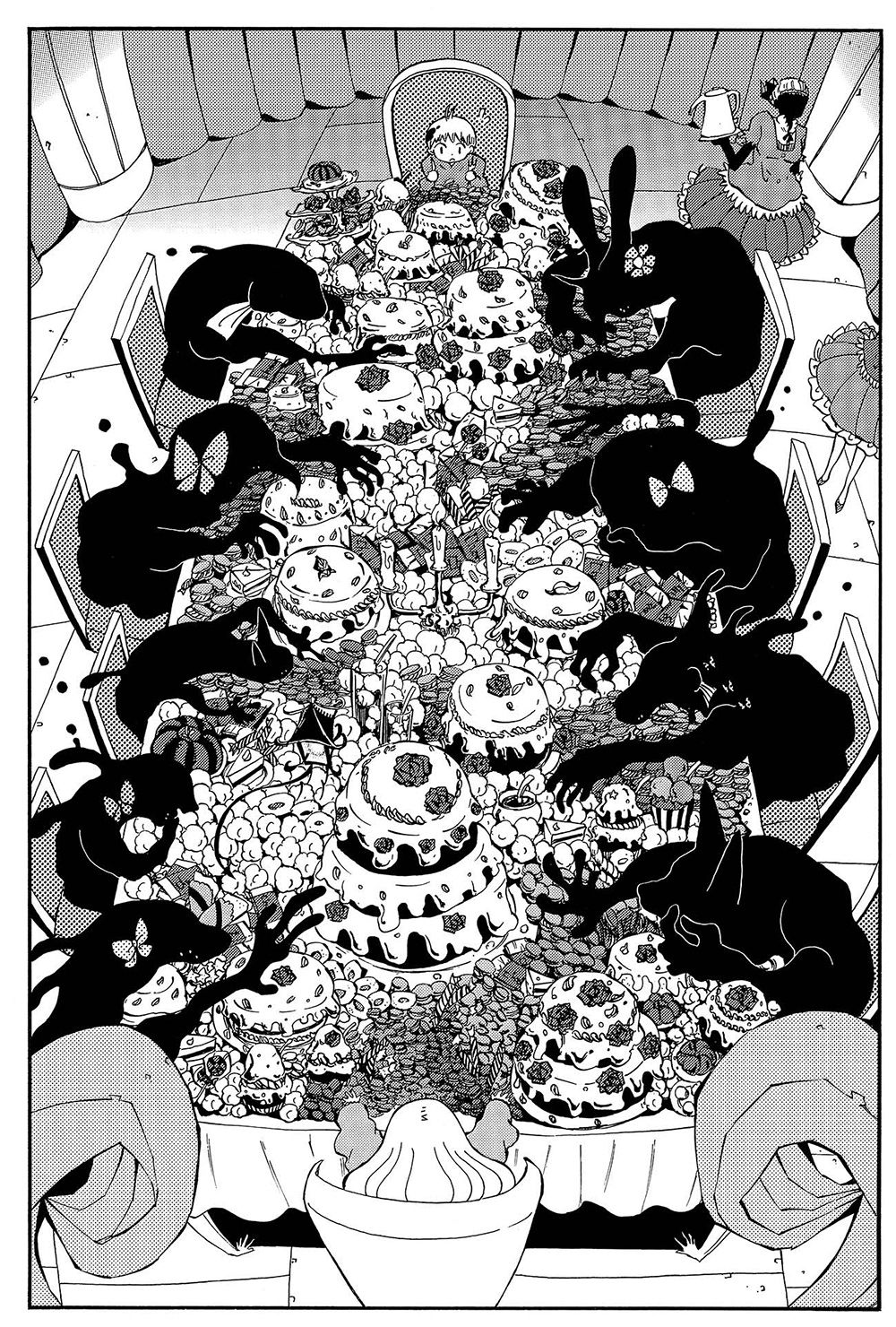 Et sinistre, car très vite on ressent bien quelque chose de pesant. Ca commence dès les premières pages avec la marche douloureuse jusqu'à la porte, ça continue avec ces étranges ombres noires omniprésentes, avec leur façon de manger les sucreries avec en gros plan leurs dents et de nombreuses onomatopées "crunch" qui créent efficacement un petit malaise... Il y a aussi la mystérieuse voix entendue par le garçon et qui lui conseille de ne surtout pas manger ces sucreries, le fait que Charon lui déconseille de s'éloigner d'elle auquel cas il redeviendra complètement noir... Et ce n'est que le début, car pas mal d'autres éléments seront là pour susciter un certain effroi, en tête la recette des macarons par Charon qui est une chose horrible génialement présentée de façon joyeuse...