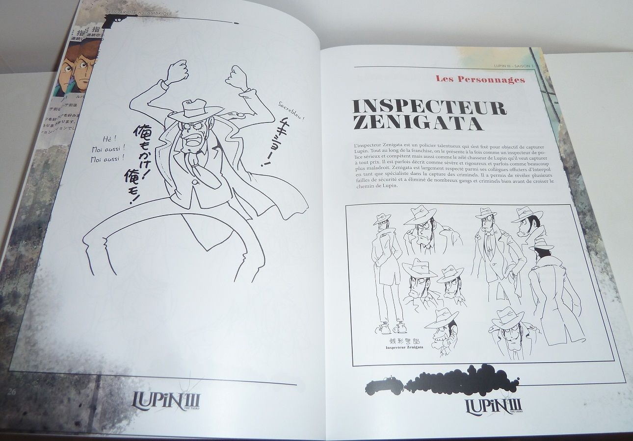 Ce dernier n'est pas avare en contenu avec différents textes (présentation, historique, présentations des principaux personnages, casting, armes, accessoires, petite interrogation concernant le côté anti-héros de Lupin III, présentations des épisodes) et pas mal d'illustrations, notamment dans la dernière partie proposant sur chaque double-page une illustration couleur et son équivalent en croquis noir et blanc.